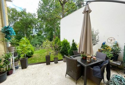 Terrasse de 25m² et jardin arboré de 65 m². En face d'une forêt appartenant à la copropriété.