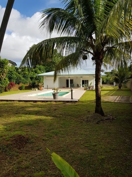 Maison T4 indépendante de plain pied avec piscine. Idéalement localisée dans une petite impasse, quartier calme, proche commerces, espace de vie extérieur très agréable, jardin arboré, abri voiture et abri jardin. Grande piscine au sel et plage américaine, large plage autour de la piscine. Moteur et liner récents. 3 chambres dont 2 climatisées, 1 grand séjour, 1 grande cuisine équipée ouverte, 1 buanderie, 1 salle de bain meublée avec baignoire d'angle, douche, wc et bidet. Volets électriques. Alarme. Chauffe-eau solaire, isolation plafond. Abri voiture entièrement carrelé. Peinture extérieure et toiture refaites. Possibilité d'aménager le bord de la crique avec un carbet.