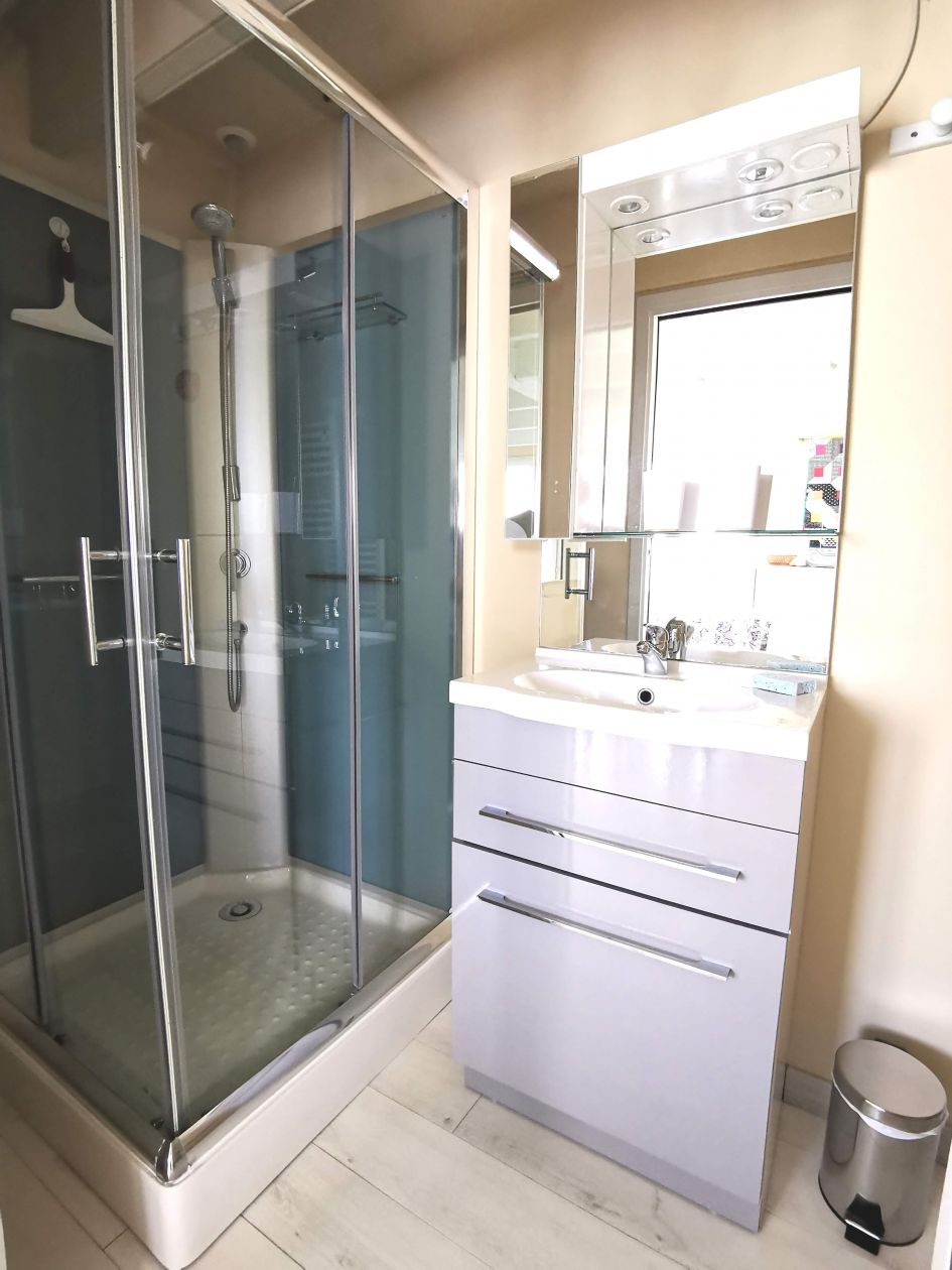 Gîte de 45 M2, séjour, cuisine, salle de douche au rez-de-chaussée, chambre à l'étage.