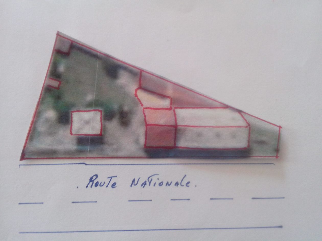 Ancien batiment comprenant grosse maison ( 1 étage) de 4 grandes chambres . Grande piece a vivre 45 m2 env et une piece 18 m2 . Grande terrasse carrelée dont une partie couverte . Au nord de la maison un garage/entrepot/atelier de 250 m2 avec fosse et 2 grandes ouvertures pour petits camions . Au sud du batiment 900 m2 de terrain plat . La proprietée est en Bordure de Grande Route Nationale . Totalement clos .Important impacte publicitaire .
